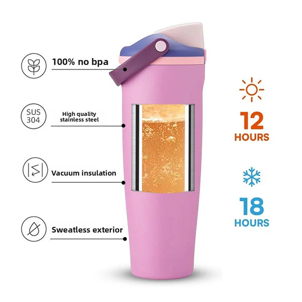 * Пити без стресу-ковпачка проста без зайвих деталей, і ви можете пити з будь-якого кута приємно, як пити зі склянки або кружки. Подвійна стінка з нержавіючої сталі, з вакуумом між внутрішніми та зовнішніми стінками, запобігає передачі тепла.